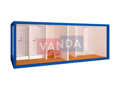 Для автономной работы душ-контейнер снабжается водонагревателем и водяным накопительным баком. Количество душевых кабинок зависит от пожеланий заказчика, но, как правило, их количество не превышает 3-5 штук.